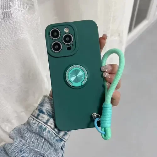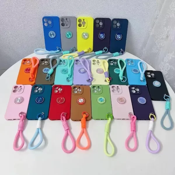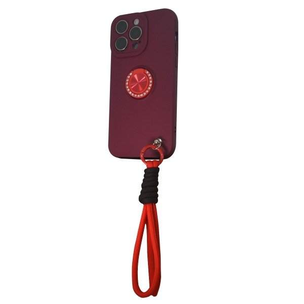Funda silicona, con separación de cámaras, felpa interna, anillo de stras y correa de mano.